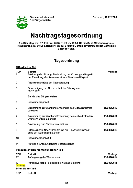 Amtliche Bekanntmachung über die Sitzung der Gemeindevertretung am 17.02.2026 - Bereitsstellungstag: 09.02.2026